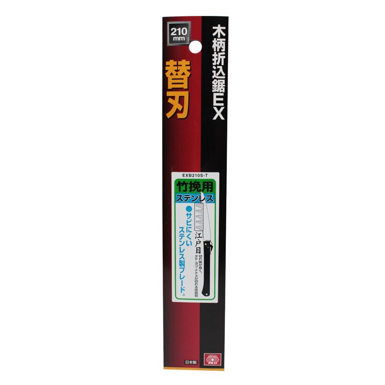 | 刃渡り:210mm。適合機種:木柄折込鋸EX(木工用210mm(EX210-M)・竹挽用210mm(EX210-T))。適合機種:木柄折込鋸EX(剪定用210mm(EX210-SE)・両刃鋸210mm(EX210-RY))。適合機種:木柄折込鋸EXステン(木工用210mm(EX210S-M)・竹挽用210mm(EX210S-T))。 |