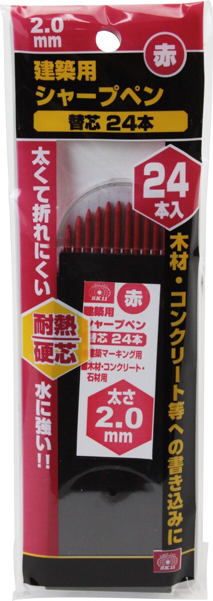 色:赤。芯太さ:2.0mm。入数:24本。適合本体:SK11建築用シャープペン3連発・ショート。(材質)本体:顔料。ケース:ABS。