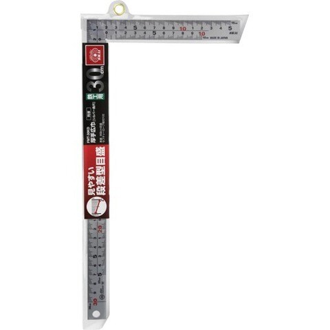 | サイズ:300mm。目盛:(長手)外30cm内25cm・(妻手)外15cm内10cm。本体サイズ:320mm(妻手160mm)×幅20mm×厚さ2.0mm。JIS1級目盛。表裏8段cm目盛。目盛側面の直角度:100mmにつき0.1mm以下。長さの許容差:300mm±0.2mm。セフティーロープ取付穴付き。(材質)ステンレス。 |