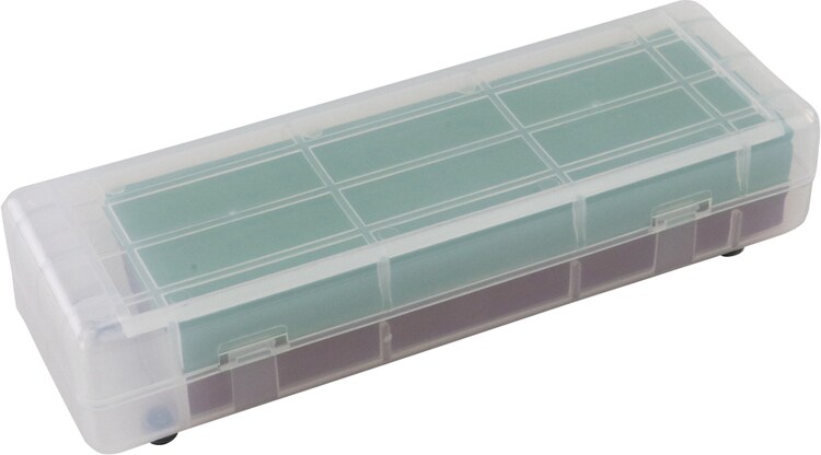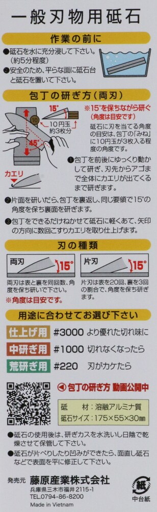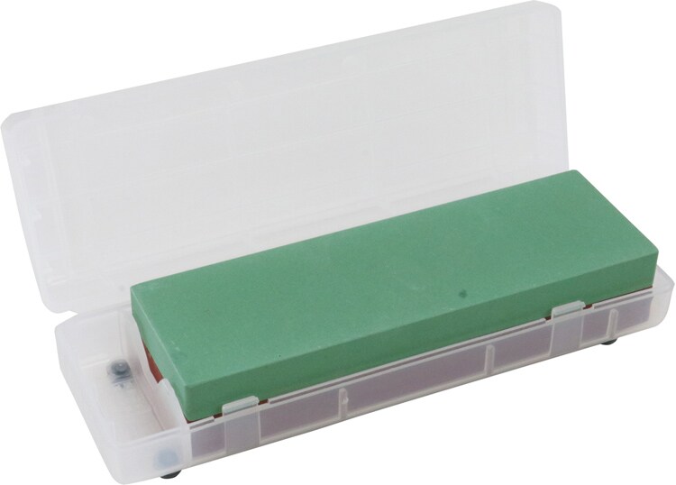 | 砥石サイズ:約175×55×30mm(2種類の砥石を貼り合わせ)。砥材粒度:220/1000。(材質)砥材:溶融アルミナ質。 |