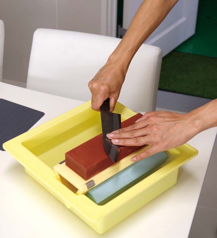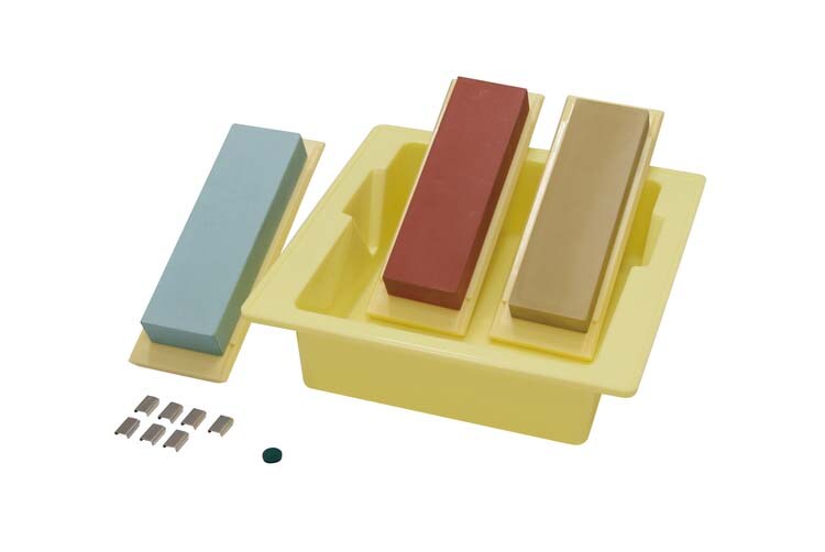 荒・中・仕上げの3種類の砥石のセットです。刃物の状態に合わせて、使う砥石を選択できます。水をつけながらの作業を楽に行うため、専用の研ぎ桶がセットになっています。砥石のセッティングは、クリップ式で簡単にできます。