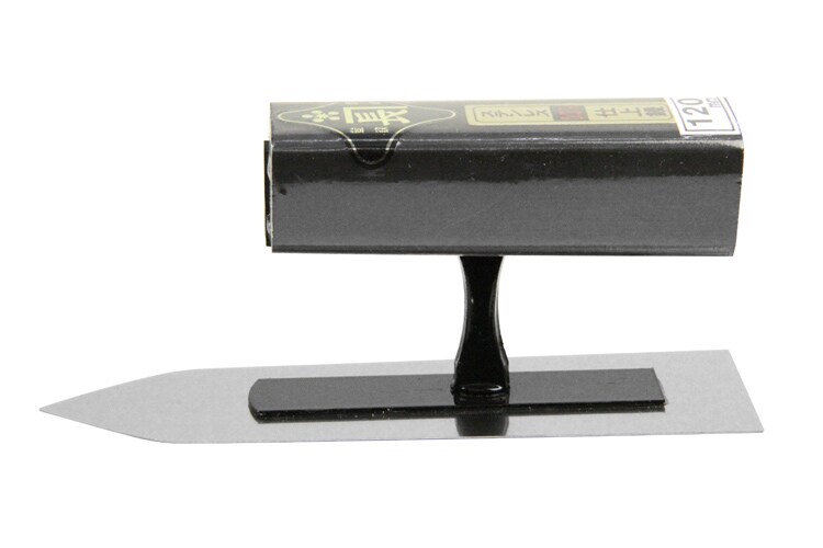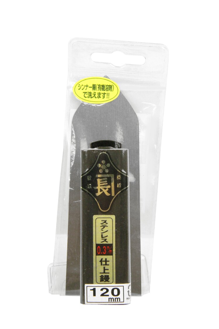 | サイズ:120mm。板厚:03.mm。黒塗り角柄。ハードランダム接着。(材質)柄:木。 |