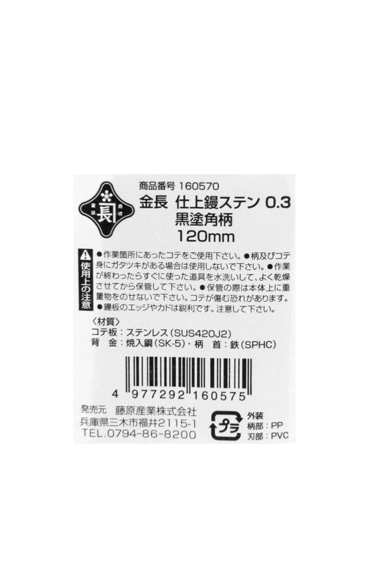 金長 仕上鏝 ステンレス 0.3 黒塗角柄 120mm (1本)
