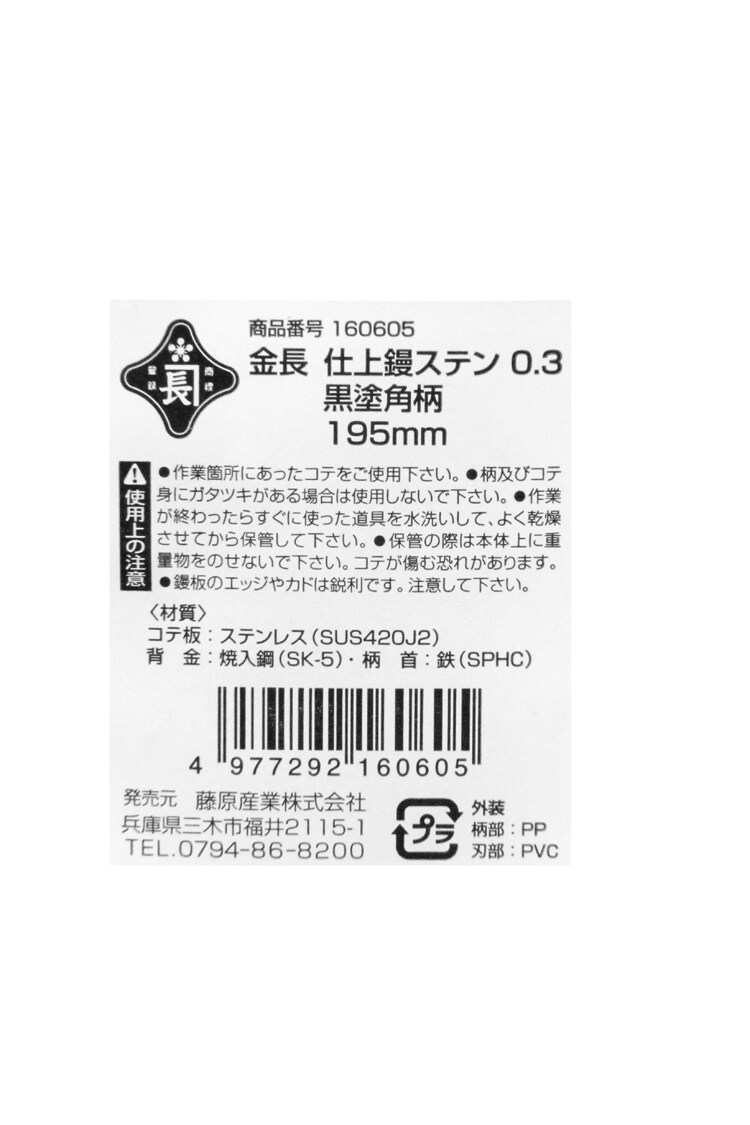 【金長 仕上鏝 ステンレス 0.3 黒塗角柄 195mmの商品詳細】