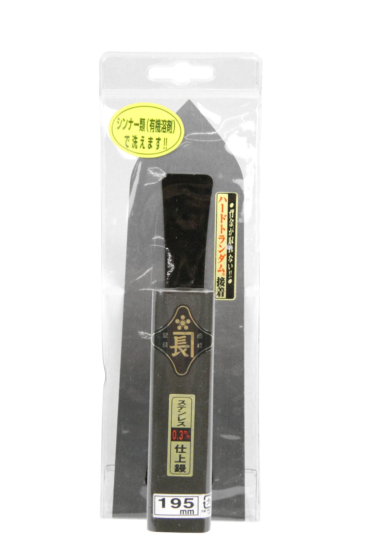 サイズ:195mm。板厚:03.mm。黒塗り角柄。ハードランダム接着。(材質)柄:木。