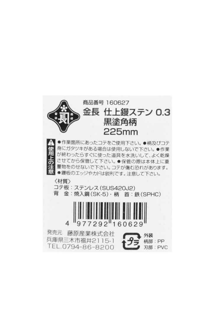 【金長 仕上鏝 ステンレス 0.3 黒塗角柄 225mmの商品詳細】