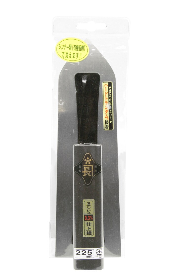 サイズ:225mm。板厚:03.mm。黒塗り角柄。ハードランダム接着。(材質)柄:木。