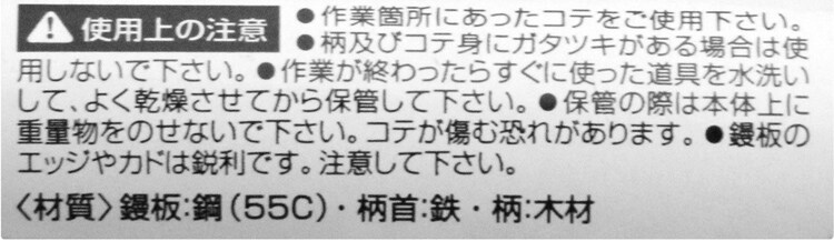 | 鏝板サイズ(約):幅150×長さ170mm。(材質)鏝板:鋼(55C)。柄首:鉄。柄:木材。 |