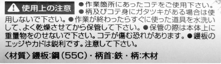 | 鏝板サイズ(約):幅140×長さ160mm。(材質)鏝板:鋼(55C)。柄首:鉄。柄:木材。 |