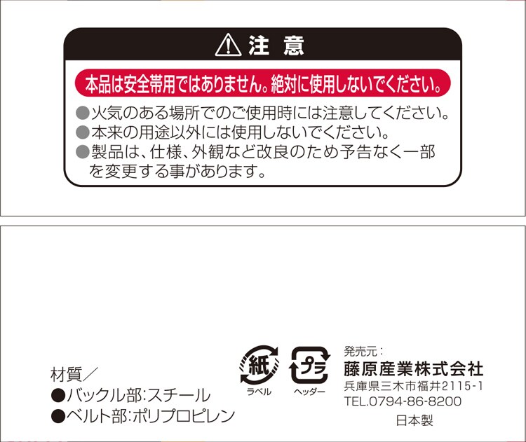 ・本品は安全帯用ではありませんので、絶対に使用しないでください。・火気のある場所でのご使用時には注意してください。・本来の用途以外には使用しないでください。・製品は、仕様、外観など改良のため予告なく一部を変更することがあります。