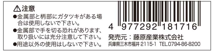 ・金属部と木柄にガタツキがある場合は使用しないでください。・金属部で手を切る恐れがありますので取扱いには充分注意してください。・使用用途以外の使い方はしないでください。・作業中は作業手袋、ゴーグルなどを着用ください。・品質向上、改善を目的に予告なく仕様を変更する場合がございます。