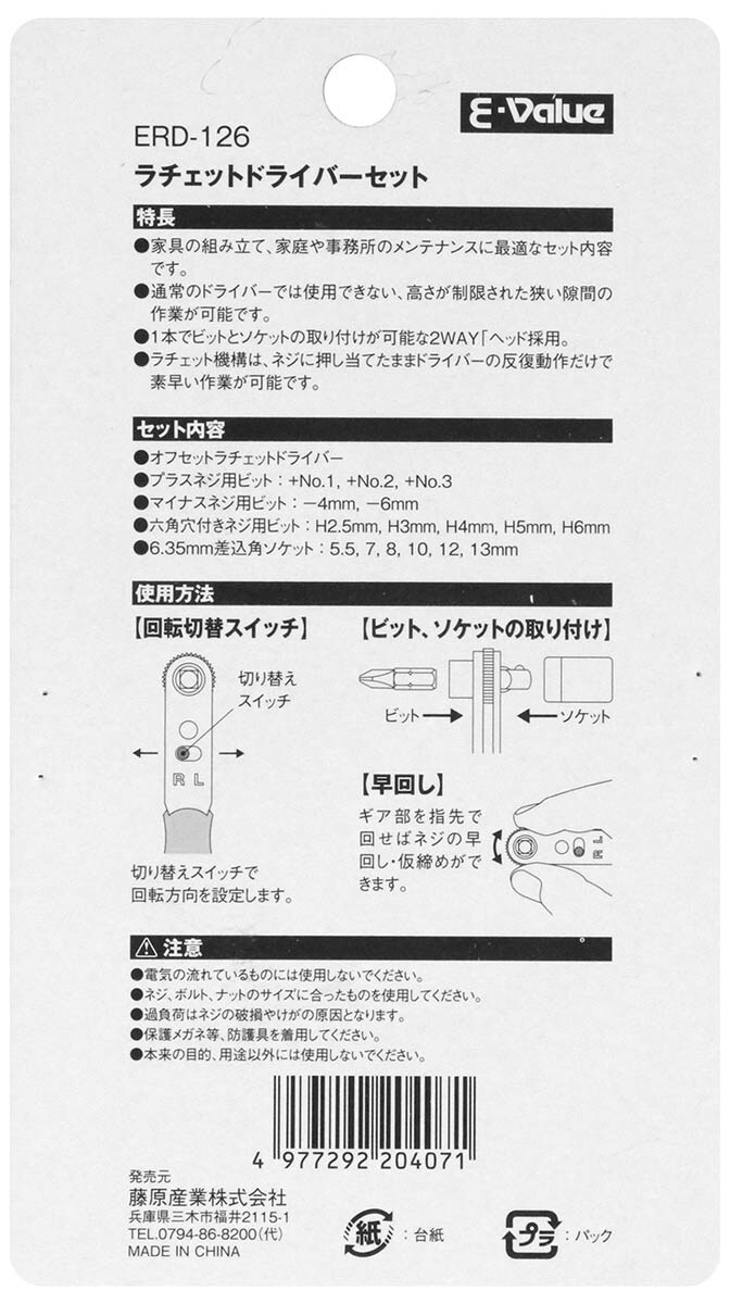 E-Value ラチェットドライバーセット 2WAYヘッド ビット・ソケット使用可能 ERD-126 (1セット)