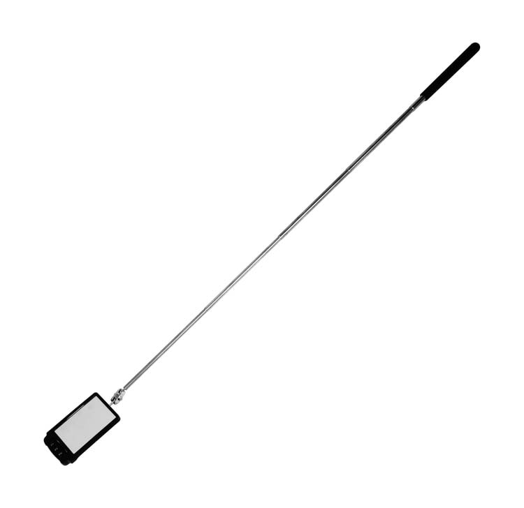 LEDライト付きで暗い場所でも点検個所を明るく照らします。5段階伸縮で29.5cmから88.5cmまで伸縮自在です。携帯に便利なクリップ付きです。角度調整可能なLEDライトです。