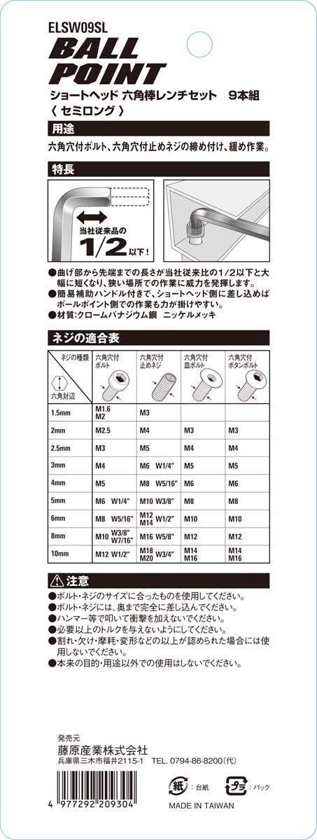 【E-Value ショートヘッド 六角棒レンチセット セミロング ELSW09SL 9本組の商品詳細】