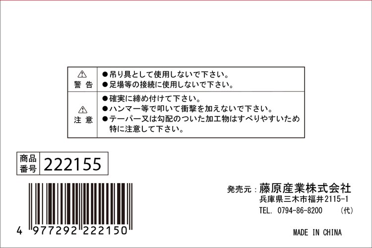 ・吊り具として使用しないで下さい。・足場等の接続に使用しないで下さい。・確実に締め付けて下さい。・ハンマー等で叩いて衝撃を加えないで下さい。・テーパー又は勾配のついた加工物はすべりやすいため特に注意して下さい。