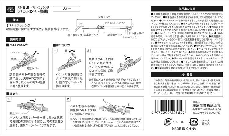 | ベルト幅:38mm。全長:5m(固定側1m/調整側4m)。最大使用力:4kN(407kg)、破断荷重:16kN(1630kg)。バックルの種類:ラチェットバックル。端末の仕様:ナローフック。ベルトカラー:ブルー。(材質)ベルト:ポリエステル。 |