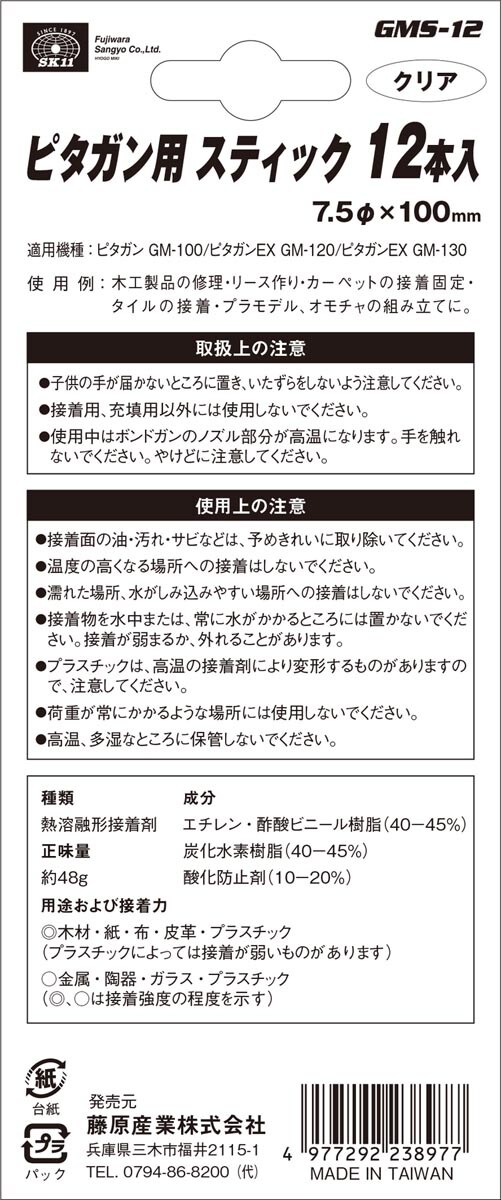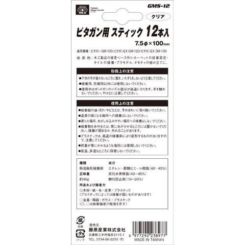 サイズ:径7.5mmx100mm。12本入。カラー:クリア。適合機種:ピタガンEX(GM-120)・ピタガン(GM-100)。【材質】成分:エチレン・酢酸ビニル樹脂。成分:炭化水素樹脂。成分:酸化防止剤。