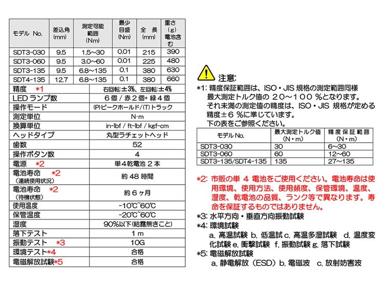 ・精度保証範囲は、ISO・JIS規格の測定範囲同様に最大測定トルク値の20~100%となります。当製品(SDT3-135)では、27~135N・mとなります。それ未満の測定値(6.8~27N・m)の精度は、ISO・JIS規格が定める精度±6%に準じています。・市販の単4電池をご使用ください。電池寿命は使用環境、使用方法、使用頻度、保管環境、温度、湿度、乾電池の品質、ランク等で異なります。寿命を保証するものではありません。・トルクのかけ過ぎ(最大値の110%以上)は故障の原因となり、精度が損なわれます。精密測定機具です。落下や衝撃、過剰な振動を与えないでください。本製品をハンマー代わりに使用しないで下さい。水の当たる環境で本製品を使用しないで下さい。(防水機能はありません。)本製品に水滴が付着した時は、直ちに乾いた布で拭いて下さい。特に塩分を含んだ海水等の付着は故障の原因になります。ご注意下さい。お手入れにアルコール、シンナー等の有機溶剤を使用しないで下さい。磁気の強い場所で使用しないで下さい。埃、砂塵の多い場所での使用、保管をしないで下さい。重大な故障の原因になります。液晶パネルを強く押さえないで下さい。本製品を操作する時はなるべくハンドルの中心を握り、徐々にトルクをかけて下さい。ハンドルの端を握ってトルクを測定しないで下さい。・本製品を長時間使用しない場合は電池を本製品から取り外して保管して下さい。長時間使用する場合や寒冷地で使用する場合は予備の電池を携帯して下さい。電池の交換の際は、2本とも新しい電池に交換して下さい。違う種類の電池や、新品と使用済みの電池を混ぜて使用しないで下さい。電流を良好に保つため、電池を装着する前に電極の湿気、油、水分をふき取って下さい。使用済み電池は各自治体の区分に従い、分別破棄して下さい。火の中に電池を投げないで下さい。・本製品の精度を保つため定期的(年1回)な校正を推奨致します。校正(有料)については、お買い求めになられた販売店にお問合せ下さい。・トルク測定時にトルクレンチの全長が変わるアタッチメント(クローフットレンチなど)を使用しないで下さい。数値が変化し正確な測定が出来ず故障の原因になります。
