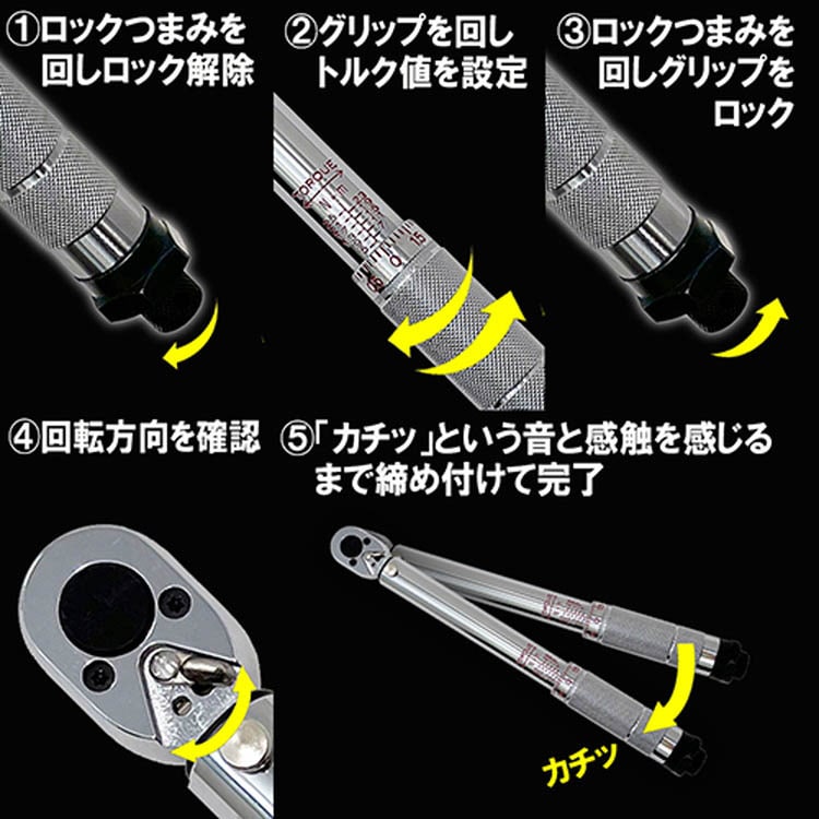 ・最大目盛り以上、最小目盛り以下のトルクでは使用しないでください。グリップの力点ラインを中心に握り、ボルトに対してレンチを直角の状態に維持しながら、レンチに対して垂直方向にゆっくりと力を掛けてください。誤った使用方法により、正確な測定ができない場合や音・ショックを感じ取りにくいことで、設定トルクを大きく超えて力をかけ過ぎてしまう恐れがありますので注意してください。測定時に「カチッ」という音がしたり、手に軽いショックを受けたらそれ以上レンチを回さないでください。過荷重による事故につながる恐れがあります。初めて使用される際は、その間隔を養ってください(特に低トルクの時は、音・ショックが感じ取りにくく、設定トルクを大きく超えて力を掛け過ぎてしまう恐れがありますので注意してください。ボルトの破損、トルクレンチの故障の原因になります)。・このトルクレンチは出荷前に厳格な調整はしていますが、特に保証用等の精密な作業には構造上向きません。ボルト・ナット・ネジや対象物の注意事項や指示書を読み、正しい状態で使用してください。ソケットはボルト・ナットに対して斜めがけや浅掛けをしないよう、奥まで完全に差し込んで使用してください。ドライブ角は根元まで完全に差し込んでください。ハンドルにパイプを継ぎ足したり、ハンマーなどで叩いたり、足で踏んでの使用はしないでください。長時間使用にならなかった場合は、内部の潤滑油がパーツに行き渡る様に最初に低いトルク値で何度か操作してください。・このトルクレンチはボルト・ナット・ネジ等を手動で緩めることのみを目的に設定されています。本来の目的、目途以外での使用はしないでください。レンチの分解・改造・調整・注油は絶対にしないでください。トルク値が狂う可能性があります。作業不良・異常音・水没等の状況が発生した場合や、割れ・欠け・摩耗・変形等の異常が認められた場合は、使用しないでください。無理な姿勢で作業しないでください。常に足場・周辺を確認して使用してください。・使用しない時は、目盛りの一番低いところにセットして保管してください。(最小目盛りより下げないでください。)このトルクレンチは精密測定工具です。落下などによる衝撃等がないように、取り扱いには十分に注意してください。レンチの汚れはウエス等で拭き取るだけに止めてください。内部の特殊な潤滑油に影響がありますので、いかなる洗浄・薬品等の使用は避けてください。