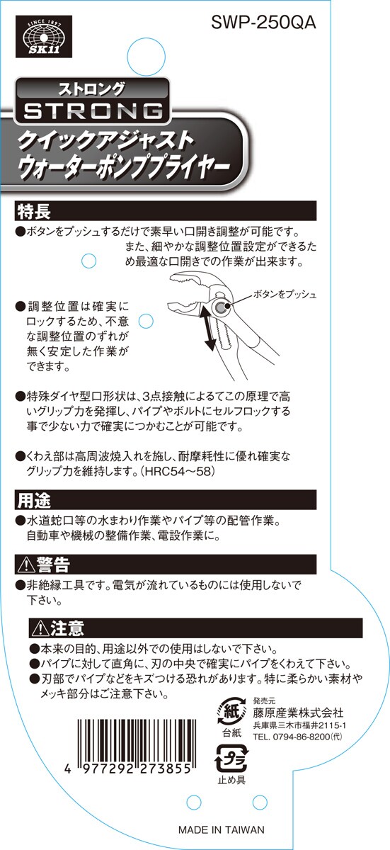 SK11 クイックアジャストウォーターポンププライヤー SWP-250QA (1本)