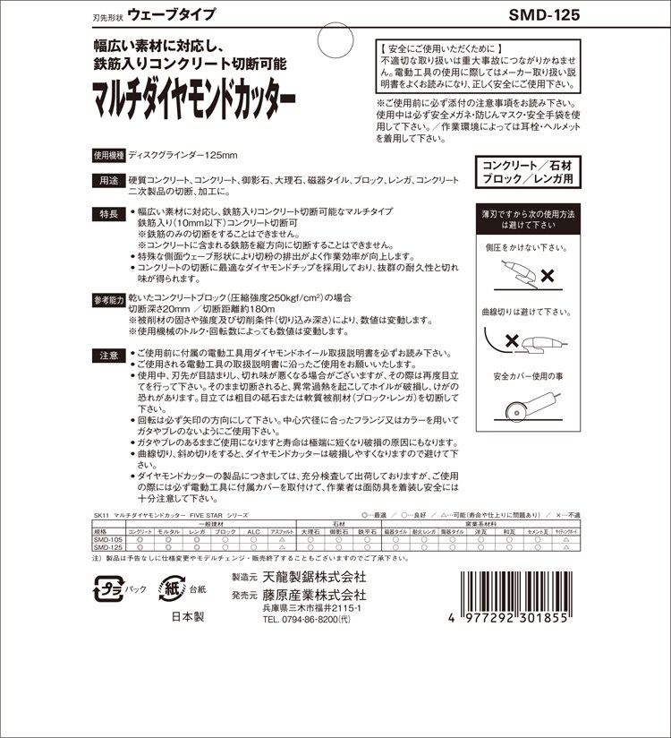 | ・外径:125mm ・刃厚:2.0mm ・ダイヤ幅:7.0mm ・内径:22mm ・最高使用回転数:12200min-1 ・使用機種:ディスクグラインダー125mm ・材質:刃先:ダイヤモンドチップ |