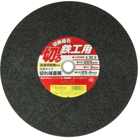 | 外径:355mm、厚さ:3.0mm、孔径:25.4mm 最高使用周速度:72m/s 砥材・粒度・硬度:A36S 適用機種:高速切断機 |