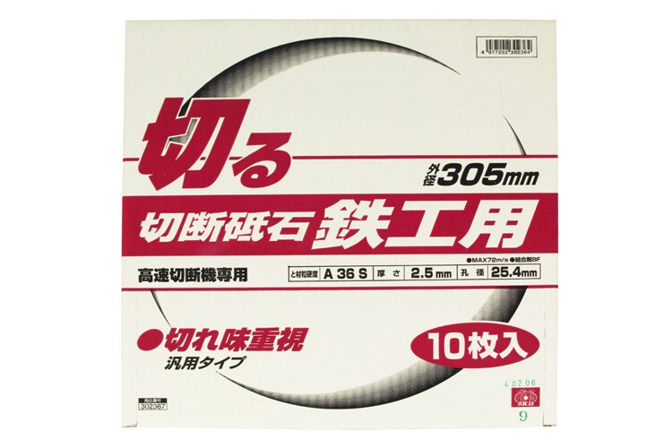 | ・用途:金属(鉄)の切断作業 ・外径:305mm ・厚さ:2.5mm ・孔径:25.4mm ・最高使用周速度:72m/s ・と材粒硬度:A36S ・適用機種:高速切断機 |