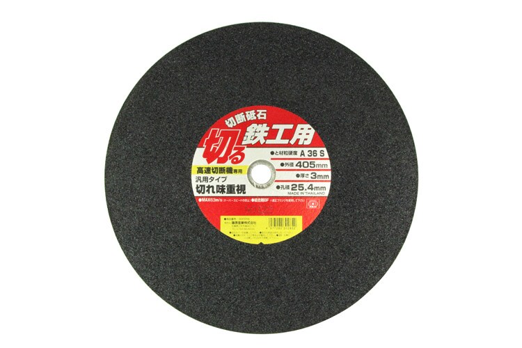 | 外径:405mm*厚さ3.0mm*孔径:25.4mm 最高使用周速度:63m/s と材粒硬度:A 36 S 適用機種:高速切断機 |