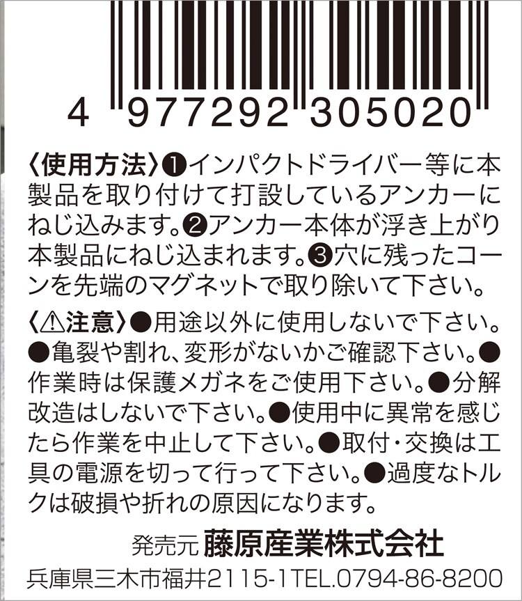 ・インパクトドライバーで過度なインパクトをかけると破損の原因になります。アンカーとビットのねじは確実に嵌めてから回してください。