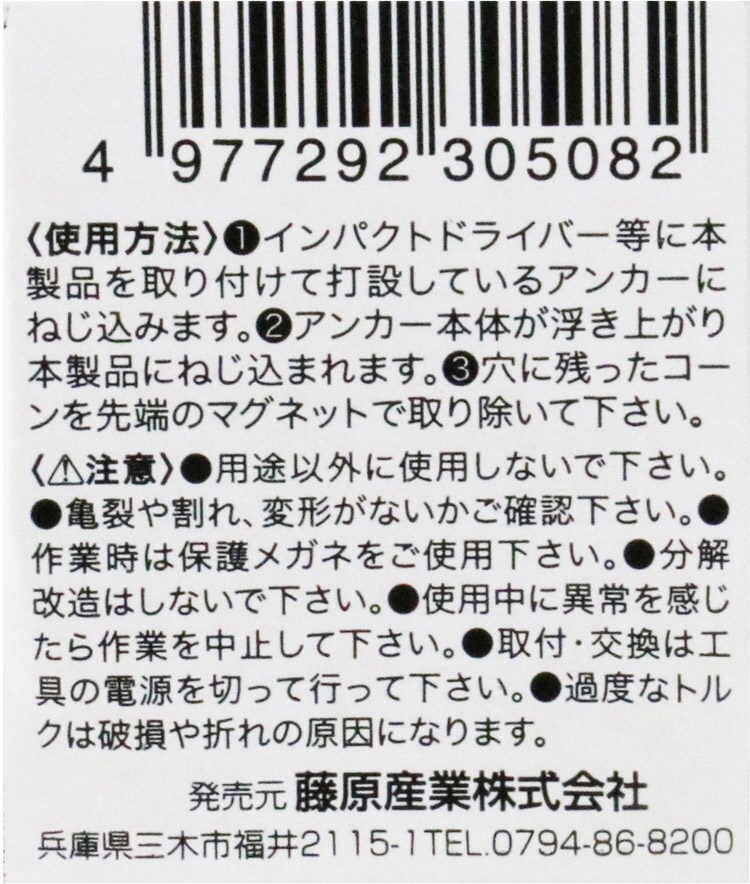 ・インパクトドライバーで過度なインパクトをかけると破損の原因になります。アンカーとビットのねじは確実に嵌めてから回してください。