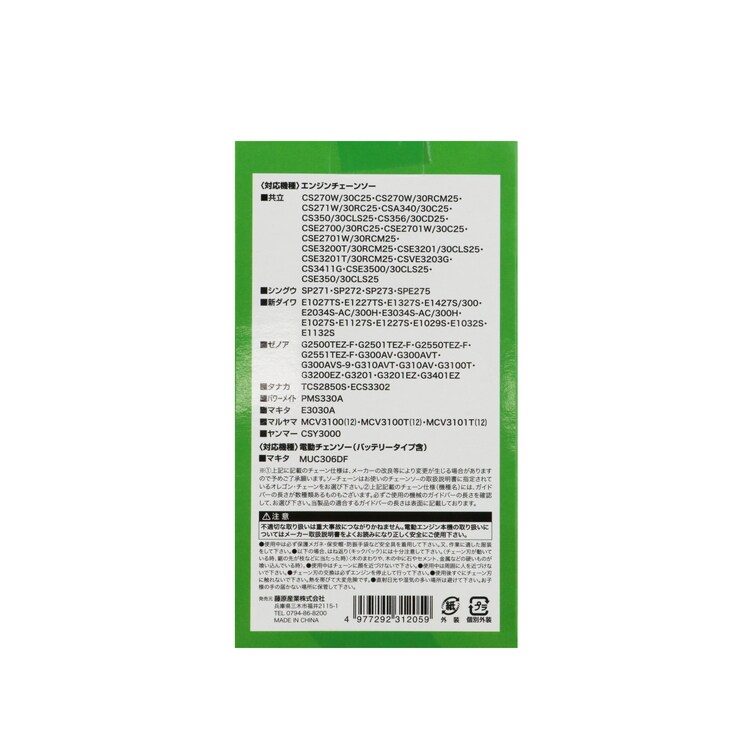 | ・相当オレゴン品番:25AP-068E ・ガイドバー長さ:12インチ(30cm) ・ソーチェーンピッチ:1/4 ・ソーチェーンゲージ:.050 ・ドライブリンクコマ数:68 |