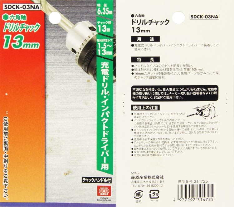 SK11 充電ドリル・インパクトドライバー用 六角軸ドリルチャック 13mm チャックハンドル付 SDCK-03NA (1コ入)