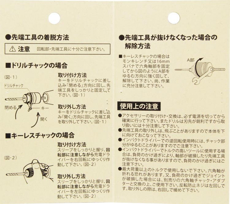 | ・用途:充電ドリルドライバー・インパクトドライバーに装着して、丸軸先端パーツを使っての作業。 ・6.35mm六角軸 ・チャック径:13mm ・取付可能サイズ:1.5-13mm ・適応機種:充電ドリル・インパクトドライバー |