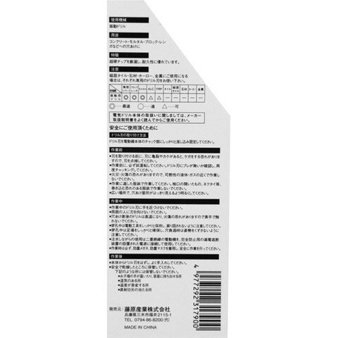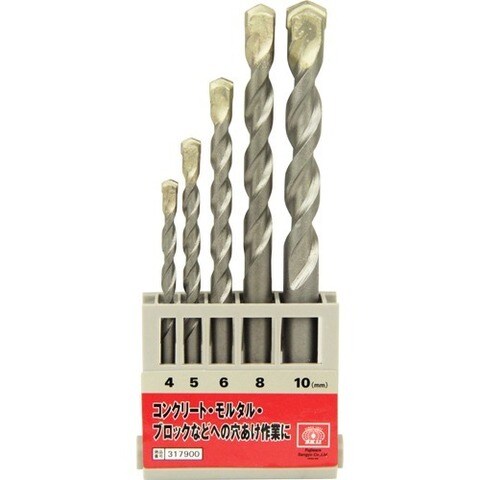 | ・サイズ:4・5・6・8・10mm ・5本組 ・適用機種:回転ドリル・振動ドリル(コンクリートには振動ドリルをご使用下さい) ・材質:刃先:タングステンカーバイトチップ ・超耐熱特殊鋼 |