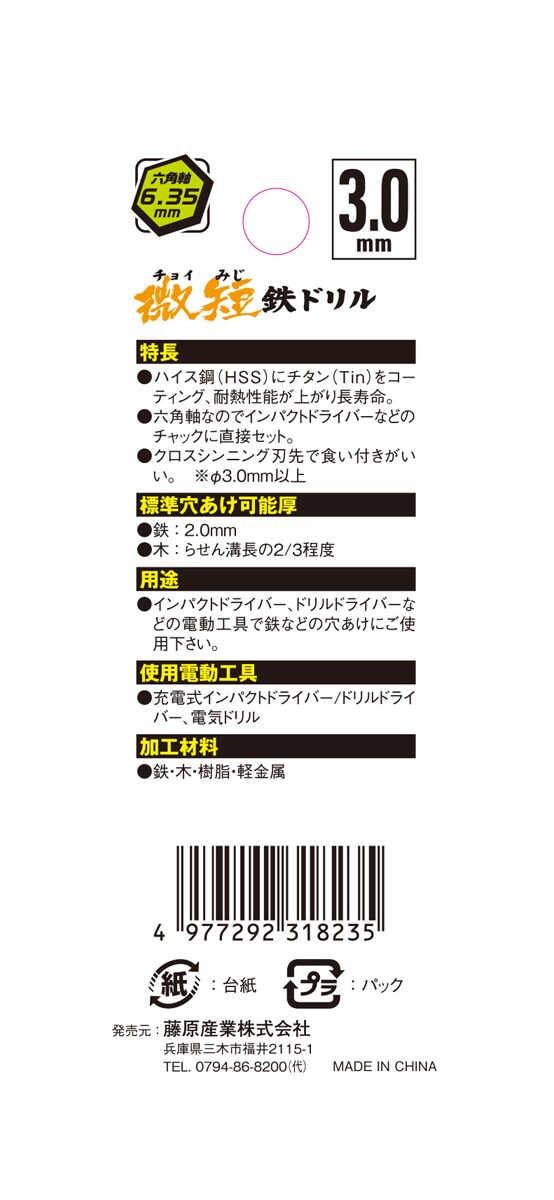 【SK11 六角軸チタンコーティング鉄ドリル 微短(チョイみじ) 3.0mm 5pcsの商品詳細】