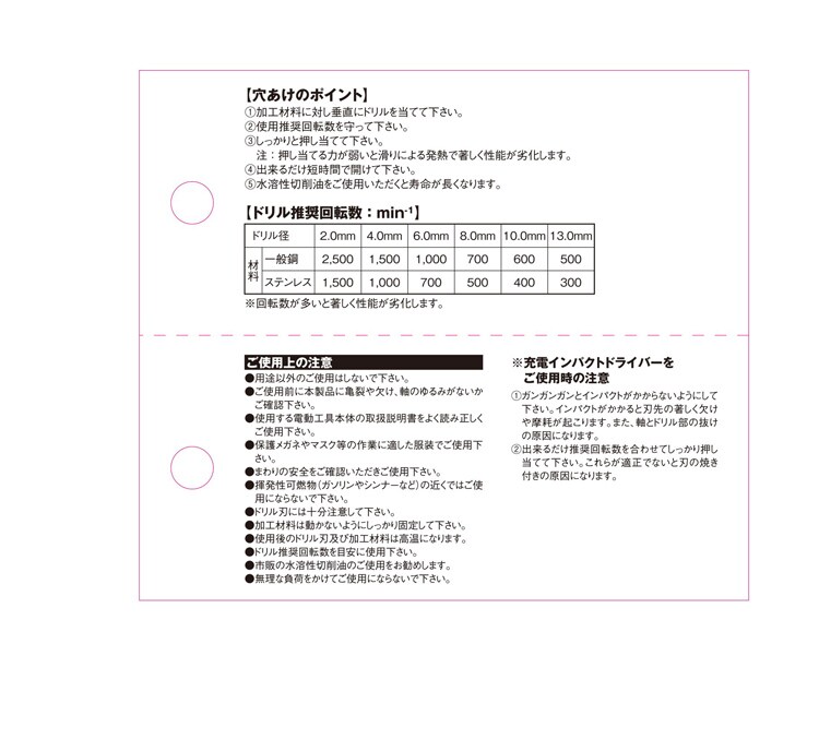 ・ドリル刃には十分注意して下さい。加工材料は動かないようにしっかり固定して下さい。使用後のドリル刃及び加工材料は高温になります。ドリル推奨回転数を目安に使用下さい。市販の水溶性切削油のご使用をお勧めします。無理な負荷をかけてご使用にならないで下さい。