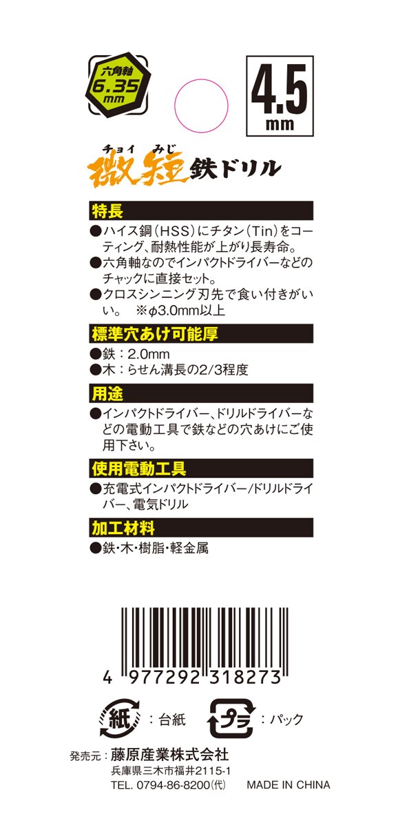 | ・サイズ:4.5mm ・標準穴あけ可能厚:(鉄)2.0mm・(木)らせん溝長の2/3程度 ・軸:六角軸6.35mm ・使用電動工具:充電式インパクトドライバー・ドリルドライバー・電気ドリル ・加工材料:鉄・木・樹脂・軽金属 ・5本組 |