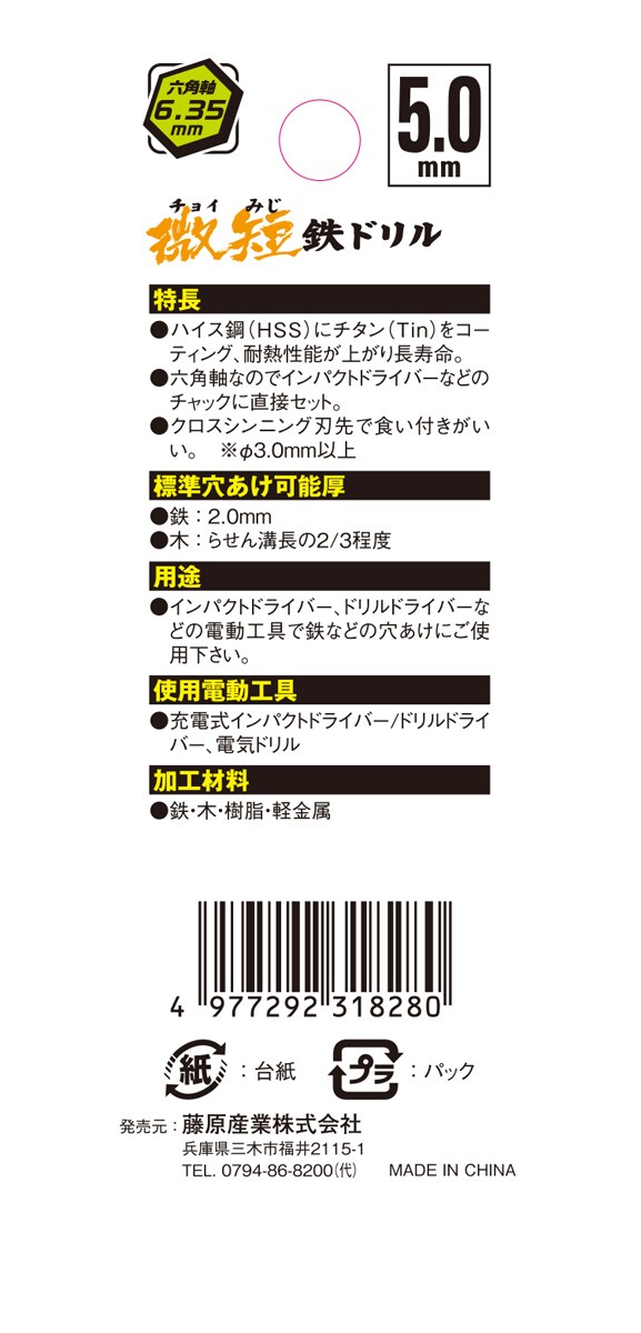 | ・サイズ:5.0mm ・標準穴あけ可能厚:(鉄)2.0mm・(木)らせん溝長の2/3程度 ・軸:六角軸6.35mm ・使用電動工具:充電式インパクトドライバー・ドリルドライバー・電気ドリル ・加工材料:鉄・木・樹脂・軽金属 ・5本組 |