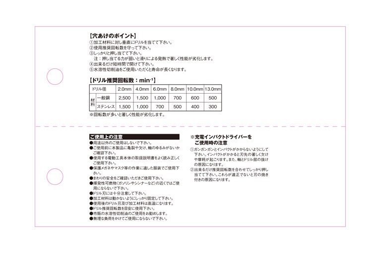 ・ドリル刃には十分注意して下さい。加工材料は動かないようにしっかり固定して下さい。使用後のドリル刃及び加工材料は高温になります。ドリル推奨回転数を目安に使用下さい。市販の水溶性切削油のご使用をお勧めします。無理な負荷をかけてご使用にならないで下さい。