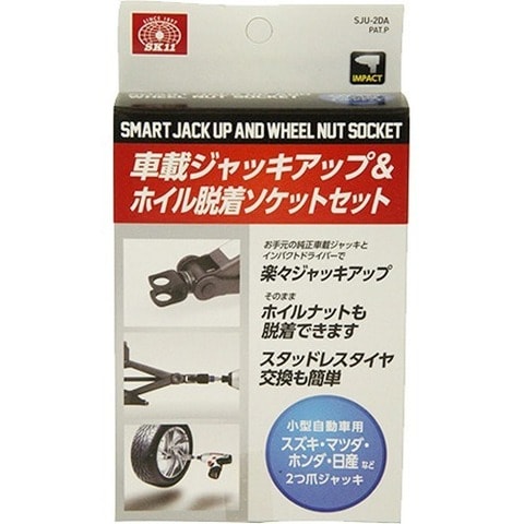 車載ジャッキアップ&ホイル脱着ソケットセットです。お手持ちの電動工具に装着することで、手を汚すことなく簡単にタイヤ交換など純正車載ジャッキが使用できます。別売SK11充電工具10.8V以上のインパクトドライバーやレンチを使用することで大変スマートに純正車載ジャッキの操作が可能になります。突然のパンクや大雪によるタイヤ交換に威力を発揮します。付属ソケットアダプター使用でインパクトドライバーでのご使用はもちろん、直接接続することでインパクトレンチ(差込角12.7mmタイプ)でのご使用も可能です。