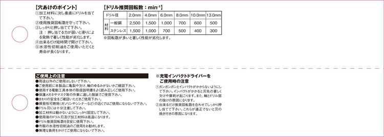 ・ドリル刃には十分注意して下さい。加工材料は動かないようにしっかり固定して下さい。使用後のドリル刃及び加工材料は高温になります。ドリル推奨回転数を目安に使用下さい。市販の水溶性切削油のご使用をお勧めします。無理な負荷をかけてご使用にならないで下さい。