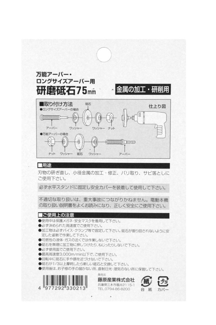 | サイズ:(直径)75mm 穴径:12.7mm 厚み:13mm 粒度:A36P 最高周速度:3000m/min 対応機種:電気ドリル 万能アーバー・ロングサイズアーバー用 |