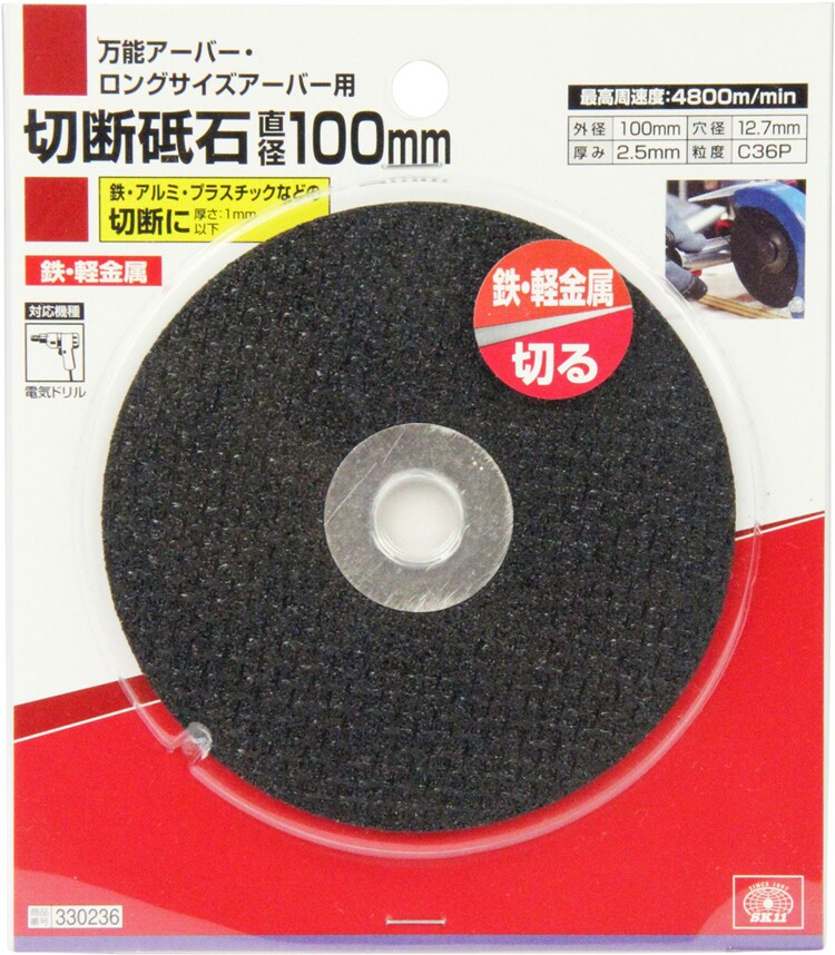 | サイズ:(直径)100mm、穴径:12.7mm、厚み:2.5mm 粒度:C36P、最高周速度:4800m/min 対応機種:電気ドリル 万能アーバー・ロングサイズアーバー用 |