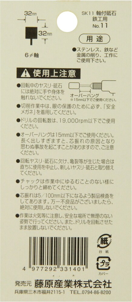 | 軸径:6mm 砥石部分巾:32mm 長さ:32mm 粒度:WA60P 適用機種:電気ドリル、エアーグラインダー |