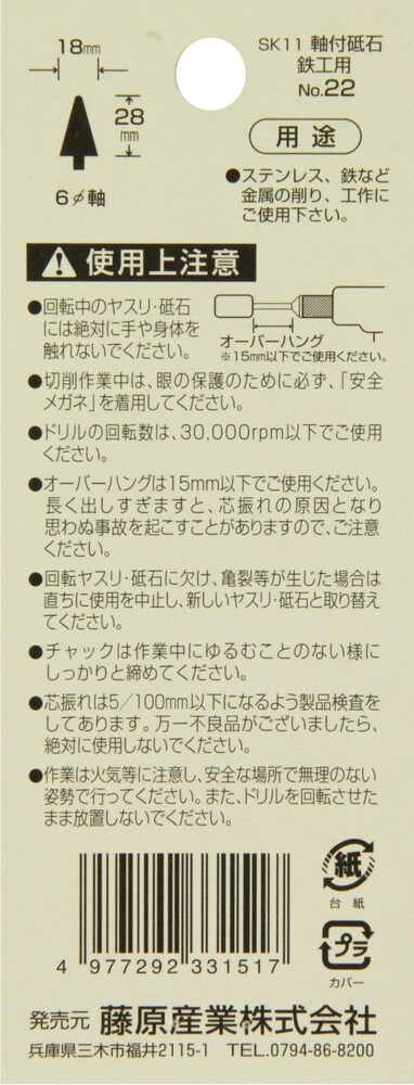 | 軸径:6mm 砥石部分巾:18mm 長さ:28mm 粒度:WA60P 適用機種:電気ドリル、エアーグラインダー |