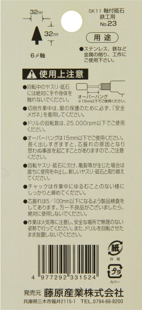 | 軸径:6mm、砥石部分巾:32mm、長さ:32mm 粒度:WA60P 適用機種:電気ドリル・エアーグラインダー |