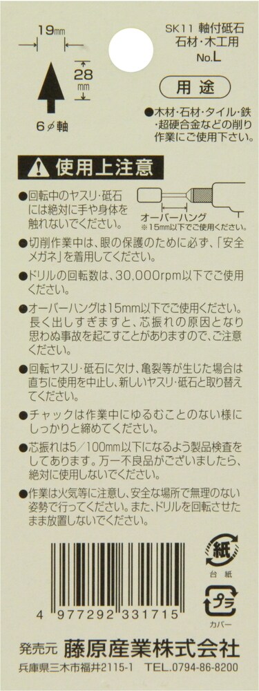 | 軸径:6mm、砥石部分巾:19mm、長さ:28mm 粒度:GC80P 適用機種:電気ドリル・エアーグラインダー |