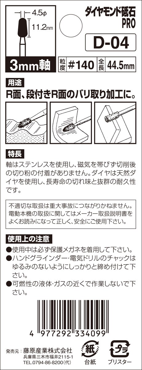 | ・軸径:3mm ・砥石部分巾:4.5mm ・長さ:11.2mm ・全長:44.5mm ・タイプ:フィッシャーラウンドタイプ ・粒度:140 ・適用機種:電気ドリル・ハンドグラインダー ・材質:軸:ステンレス製 ・天然ダイヤ使用 |