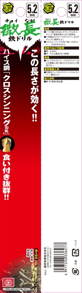 | ・サイズ:5.2mm ・標準穴あけ可能厚:(鉄)2.0mm・(木)らせん溝長の2/3程度 ・軸:六角軸6.35mm ・使用電動工具:充電式インパクトドライバー・ドリルドライバー・電気ドリル ・加工材料:鉄・木・樹脂・軽金属 |