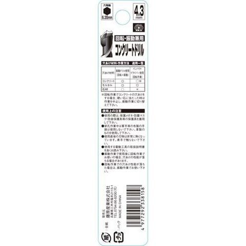| ・サイズ:4.3mm ・回転・振動兼用 ・6.35mm六角軸 ・適合機種:インパクトドライバー・回転ドリル・振動ドリル ・(材質)特殊鋼 |